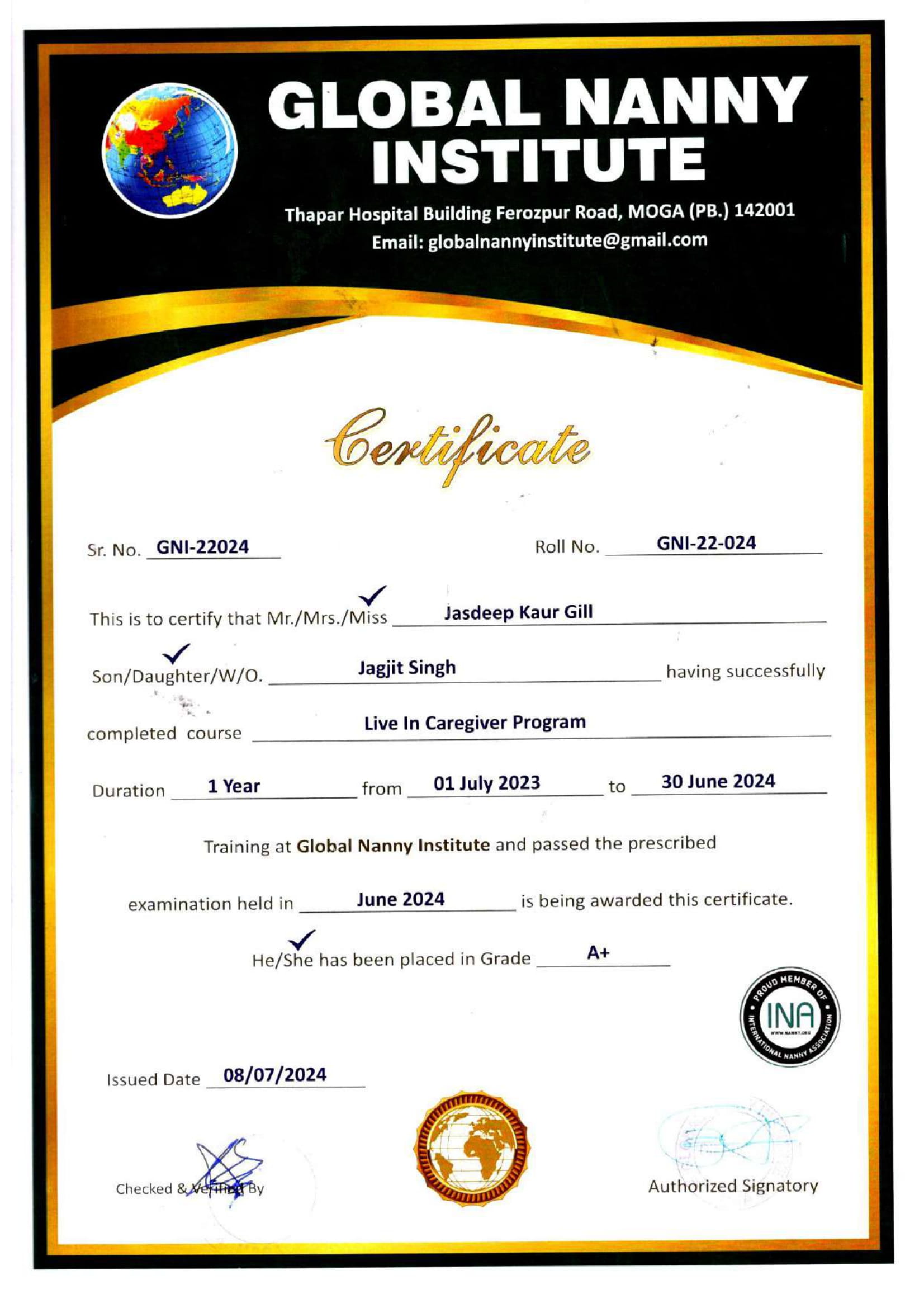 Jasdeep Kaur Gill (Certification Date : 08-07-2024)