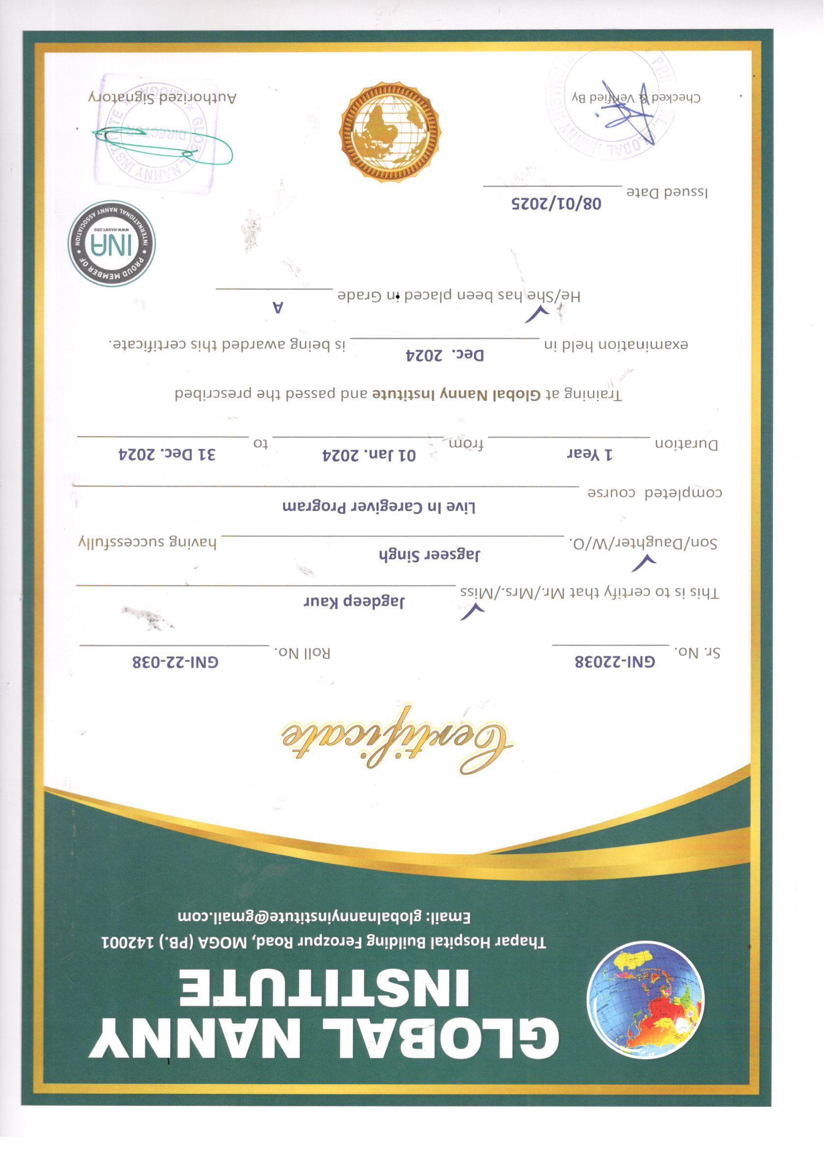 Jagdeep Kaur D/O Jagseer Singh (Certification Date : 08-01-2025)