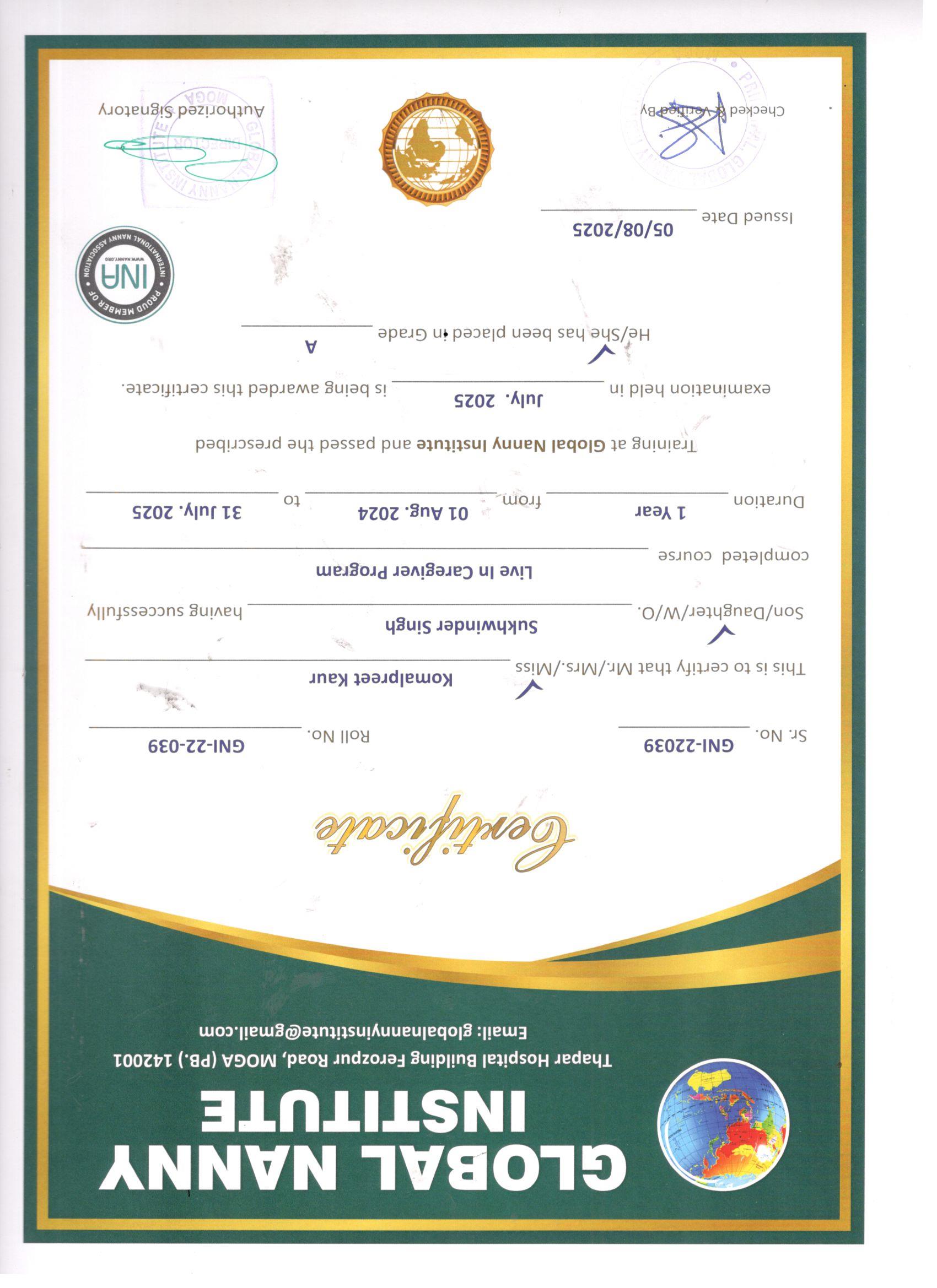 Komalpreet Kaur D/O Sukhwinder Singh (Certification Date : 05-08-2025)