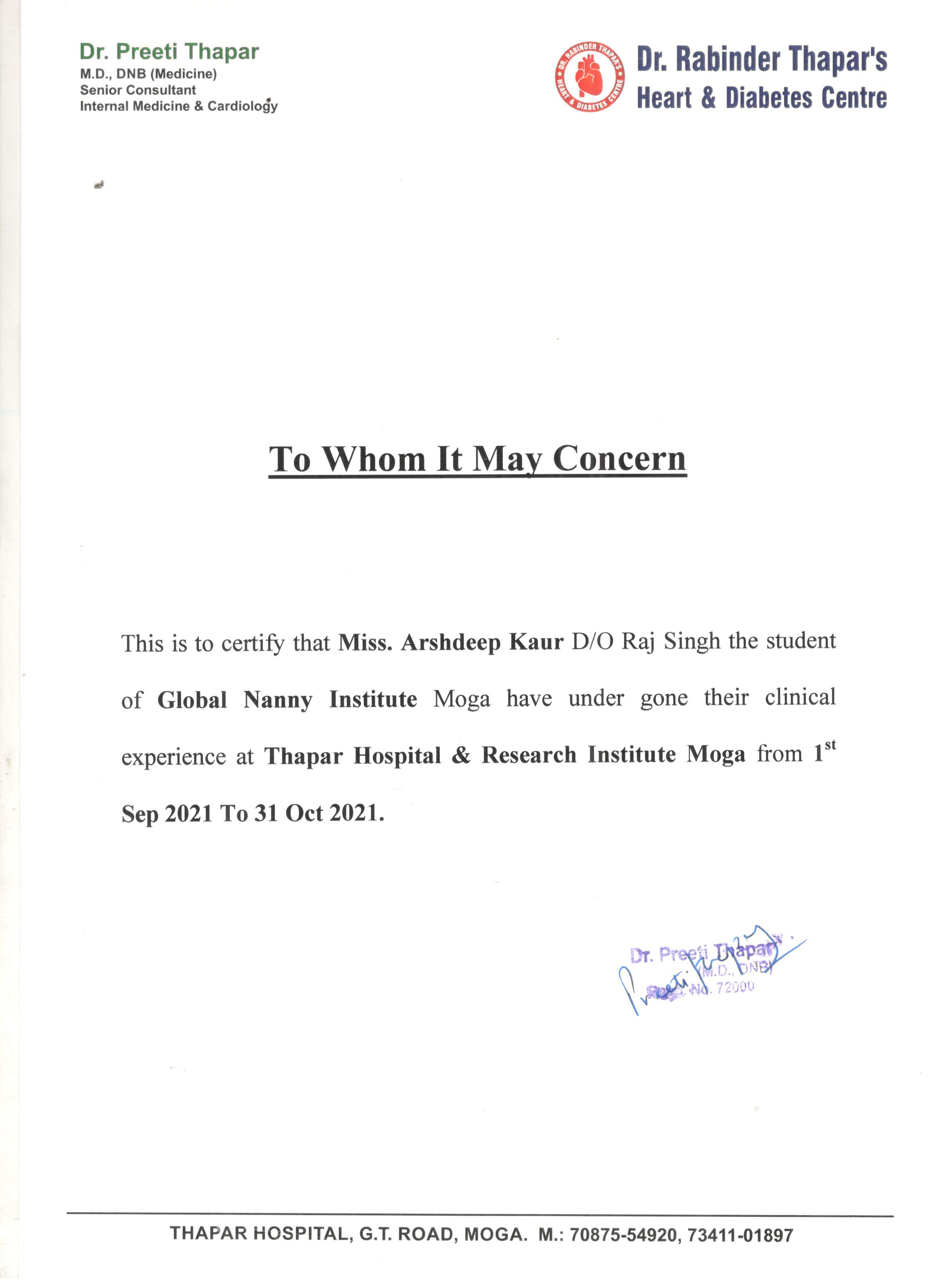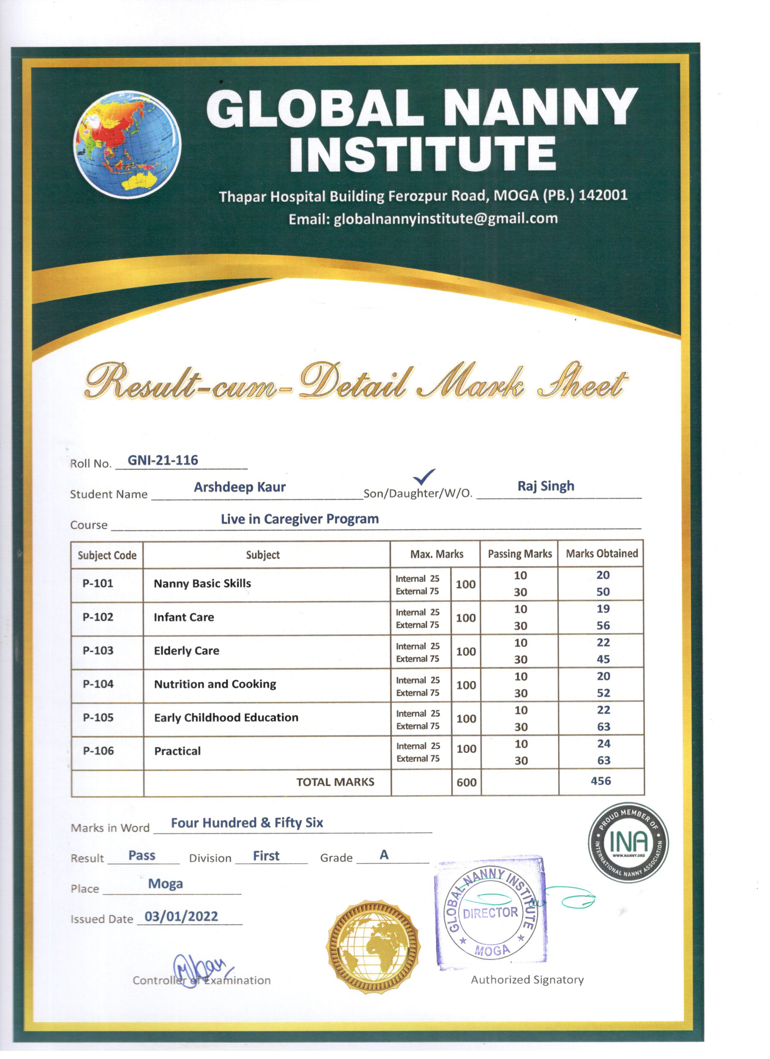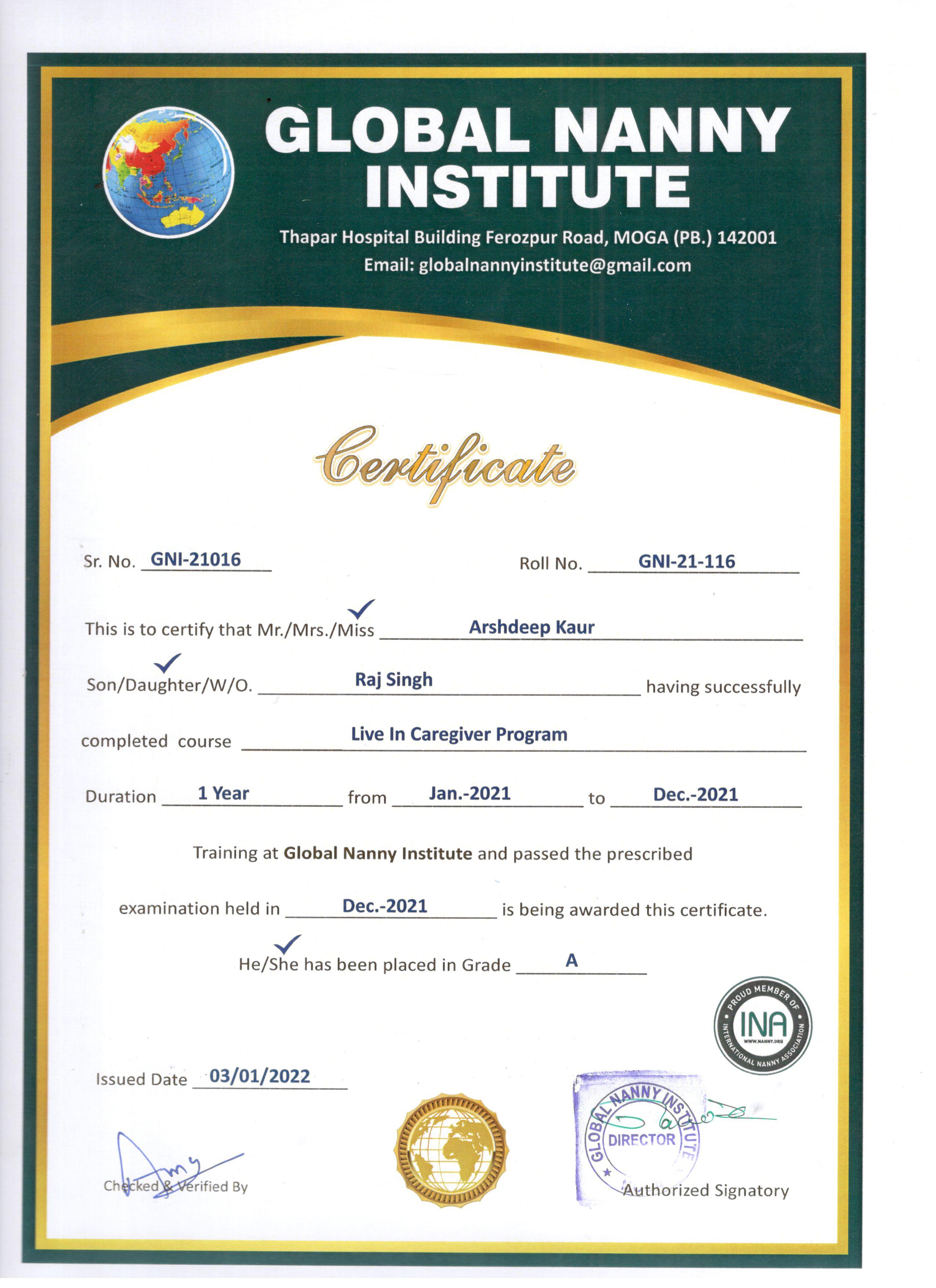 Arshdeep Kaur (Certification Date : 03-01-2022)